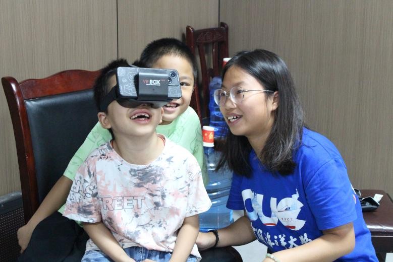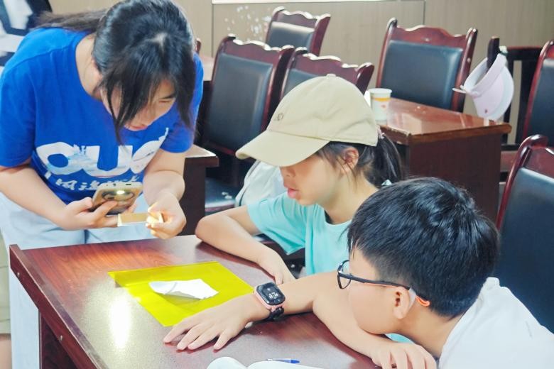 图为实践团成员带领小朋友通过三棱镜感受光的色散。杨洋供图