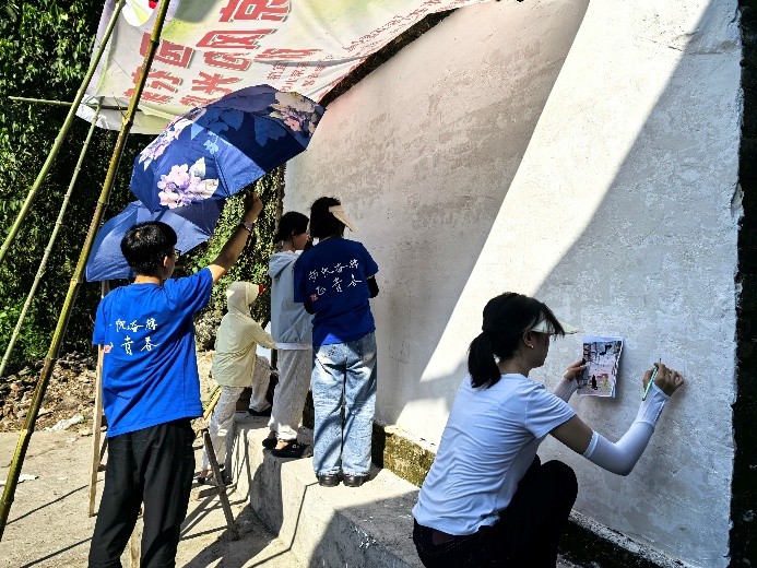 “乡村振兴既要塑形,也要铸魂”,实践团以“老墙焕新”行动激活乡村文化生命力。队员们顶着盛夏烈日,深入凉风洞农家乐及老旧街区,清理斑驳墙面、铲除松动墙皮。创作中深挖永川本土文化,将滑肉汤的市井烟火、活鱼的灵动神韵等元素融入画作,让旧墙面蜕变为承载乡土记忆的文化景观。画笔舞动间,不仅为乡村添彩,更搭建起连接传统与现代的文化桥梁,以艺术赋能乡村文化振兴,践行“把论文写在祖国大地上”的实践理念。