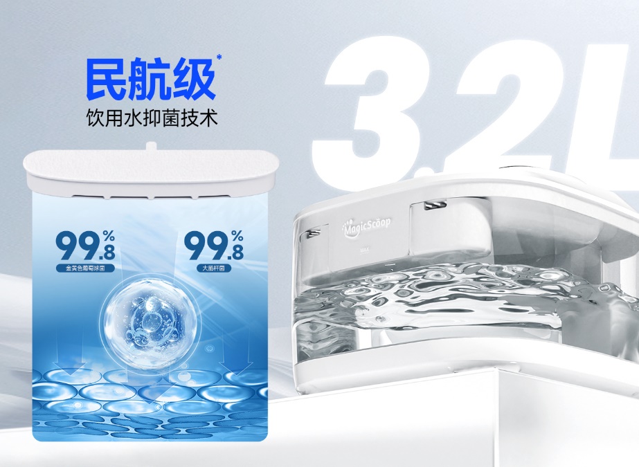 更为关键的是,它采用了民航级饮用水抑菌技术,在 30 天的使用周期内能够有效抑制细菌滋生。在宠物饮水过程中,细菌容易在水中繁殖,尤其是在温暖潮湿的环境下,普通饮水机很容易形成滑腻的细菌膜。即便是净污分离的饮水机,其水源在存储过程中,细菌仍然会不断繁殖,早已不是洁净的水源了。而 MagicScoop 魔铲 F1 的抑菌技术则像是为宠物饮水筑起了一道坚固的防线,确保每一滴水都尽可能地保持纯净,从源头上保障宠物的饮水健康。