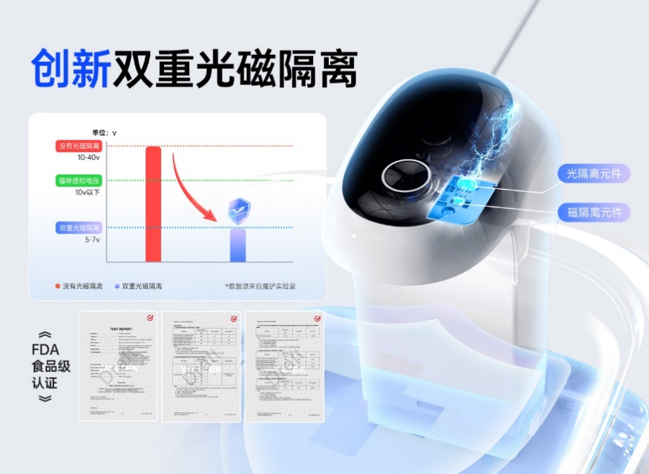 安全始终是 MagicScoop 魔铲在产品设计中的核心关注点。智能宠物饮水机 F1 采用了业界首创的水电分离技术,即水泵双重光磁隔离技术。在传统饮水机中,水与电的接触存在一定的安全隐患,一旦发生漏电事故,可能会对宠物造成严重伤害。而这种创新的水电分离设计则完全避免了此类风险,确保宠物在饮水时不会受到电击威胁。