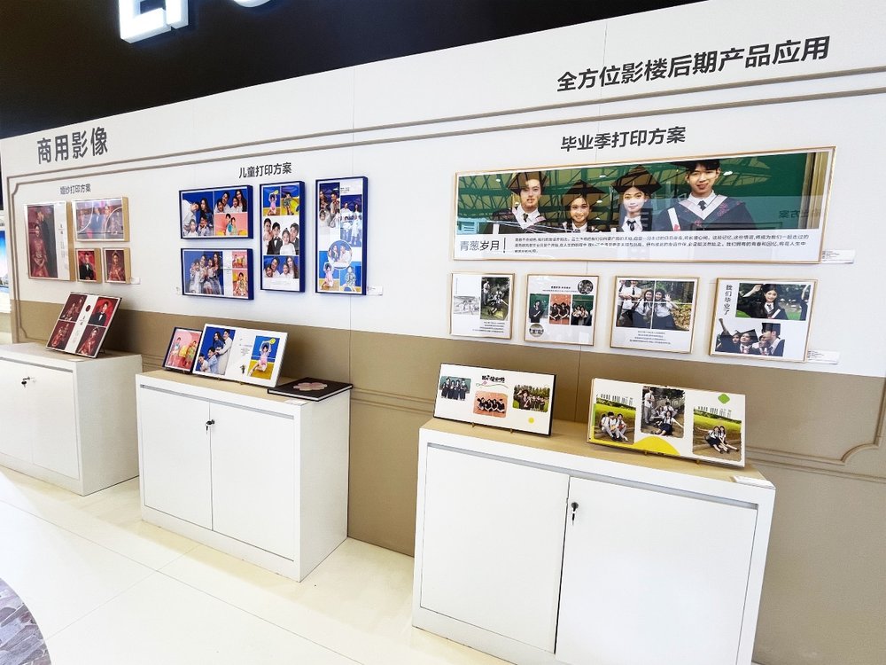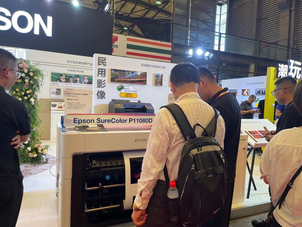 在这一展区,爱普生同步展出专为高印量客户而生的SureColor P11080D微喷级专业相册应用方案,10色染料墨水配置,为中国市场量身定制的专色红可以更好输出中国风婚纱照;4级黑配色,在输出现代风个人写真等应用上,更能体现照片的质感。。此外,SureColor T5680D高产能毕业季相册解决方案也同步展出。