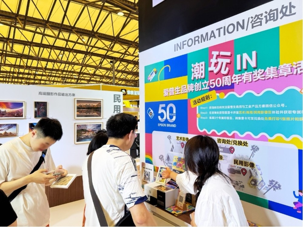 现场,爱普生一系列更具创意的影像输出方案吸引大量用户驻足。基于SureColor V1080平台式UV打印机可实现定制化样品输出,UV墨水在紫外线灯照射下即刻干燥无需等待,自动调节高度的平台式设计还可支持在多种材料与形态的物体表面上打印,让周边、纪念品等产品输出更具创意与效率。今年正值爱普生品牌成立50周年,现场爱普生还举办“潮玩IN”有奖集章活动,气氛火爆,吸引众多用户参与。