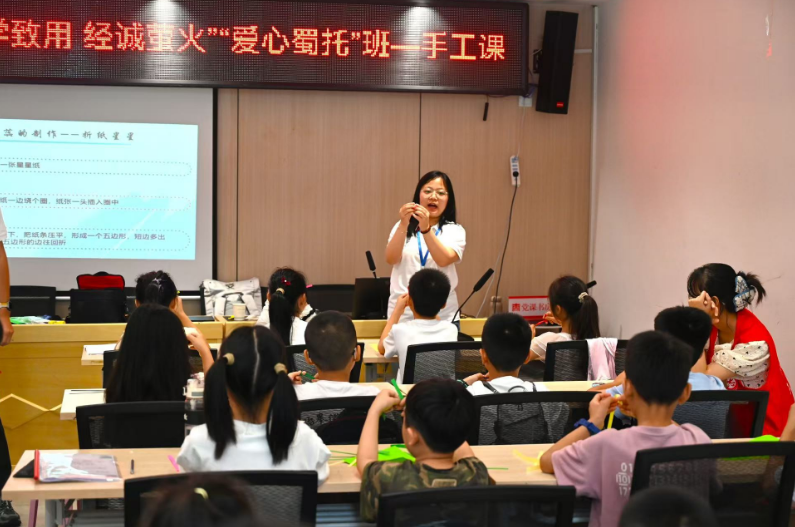 在南溪区仙源街道仙源社区和江屿社区,实践队精心开设的爱心“蜀”托班成为孩子们暑期的“快乐驿站”。针对当地儿童特点,队员们设计了一系列丰富课程。安全课与心理课上,生动的模拟演练和互动问答让孩子们掌握了自然灾害防护、人际交往安全等知识,有效提升了自我保护意识和心理韧性。素质拓展环节的团队游戏与手工制作,让孩子们在合作与创造中锻炼了协作能力与创新思维,自信的笑容洋溢在脸上。绘画课上,孩子们在“拉布布”主题创作中尽情挥洒想象力;一堂别开生面的“认识AI”课,则让孩子们近距离感受科技魅力。“智能机器人太神奇了!”孩子们踮着脚尖,争先恐后地体验,探索的种子悄然萌芽。课后,队员们耐心辅导作业,为孩子们答疑解惑,切实助力暑期学业提升。