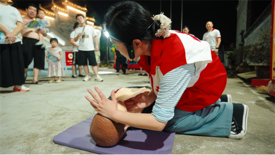 “救人时切勿盲目下水!”在芝英七村小海豚泳池边,红十字会救援队员们正模拟险情,手把手教导溺水自救与岸上救援技巧,家长和孩子们通过人体模型实操进行心肺复苏,将防溺水知识真正转化为守护生命的实践本领。