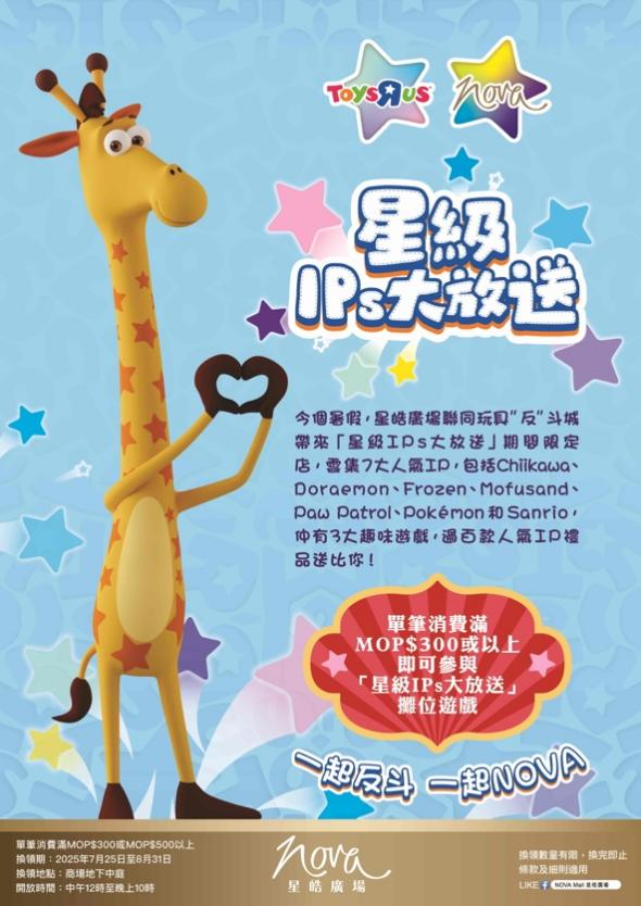 这个暑假,欢迎莅临星皓广场参与全城不容错过的焦点“星级IPs大放送”,与挚爱IP角色共创回忆,与家人共度难忘的清凉夏日。活动详情请浏览:https://www.nova.mo