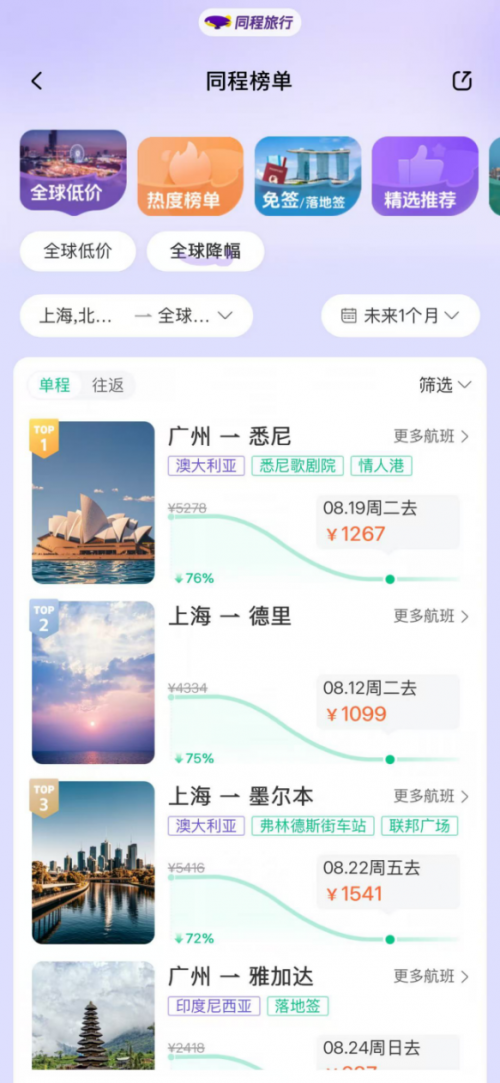 在同程旅行APP机票频道的“全球低价”榜单上,7月25日以后的未来一个月内,广州-悉尼、上海-墨尔本、广州-墨尔本、上海-布里斯班的部分航班机票含税价格降幅显著。尽管部分特价航班的中转时间超过10个小时,但是由于中转城市为免签国家,游客可以用1张直飞(折扣)机票的价格,游玩2个国家,一次性体验“四季轮转”。
