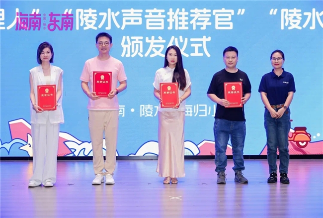 现场还举行了“陵水声音主理人” “陵水声音推荐官”“陵水声音推荐平台” 颁发仪式,北京海马行空CEO王婷、微反应科学研究院院长姜振宇、知名配音演员季冠霖及荔枝 FM 平台等获授证书,助力陵水文化魅力全球传播。