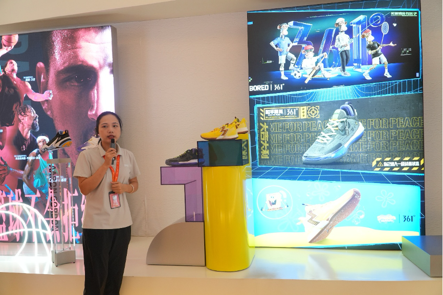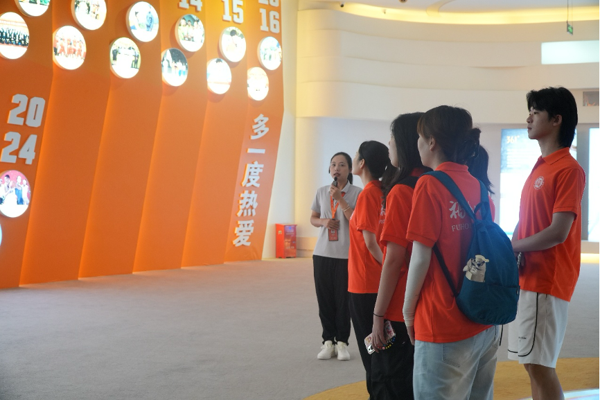 实践队的探访始于361°文化展示园区。在讲解员的带领下,队员们沿着时光脉络,系统了解了品牌从创立之初的初心使命到如今的全球布局:从早期专注于运动装备的功能研发,到如今以“多一度热爱”为理念,覆盖专业竞技、大众健身、儿童运动等多元场景的产品矩阵;从传统的生产销售模式,到融入“运动科学”理念,通过数据分析优化产品设计的创新路径。