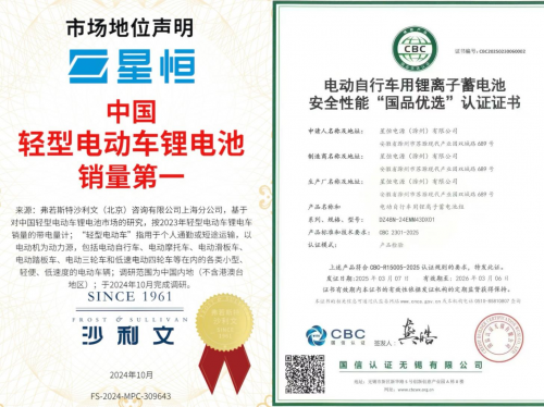 星恒锂电池对品质与安全的极致苛求,赢得了权威认可——荣获由全球著名市场研究机构弗若斯特沙利文颁发的“中国轻型电动车锂电池销量第一”市场地位证书,以及国信认证(CBC)颁发的行业首张电动自行车用锂离子蓄电池安全性能“国品优选”认证证书。这些极具含金量的证书,是星恒匠心制造与可靠品质最权威的实力勋章。