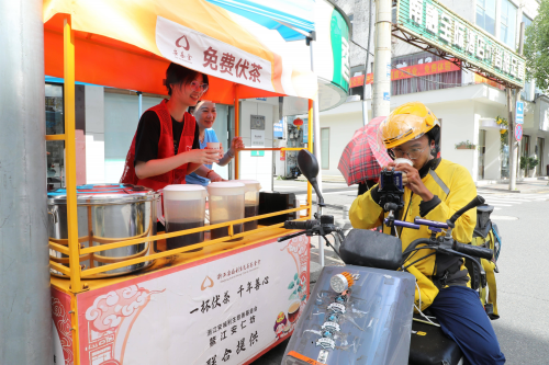 在新河南路,“香溢”志愿者王梦露正小心翼翼将一杯澄澈温热的茯茶递到外卖小哥手中:“天气热!喝点茯茶解解暑!”外卖小哥接过杯子,笑容绽开:“哎呀,你们真是有心!这大热天还专门跑一趟,喝下去连心里都舒坦了!”驿站临时支起的茶摊旁,“香溢”志愿者一边为来往顾客与周边店主斟茶,一边普及夏季防暑知识。小小的一杯茶,瞬间拉近了心与心的距离。车水马龙间,这一抹“志愿红”,不仅送上了物理的清凉,更以真诚服务传递着组织关怀的温度。一杯茯茶,把服务精准送达零售终端最前沿,让为民服务的宗旨,在酷暑中化作最沁人心脾的甘霖,润泽了群众的心田。