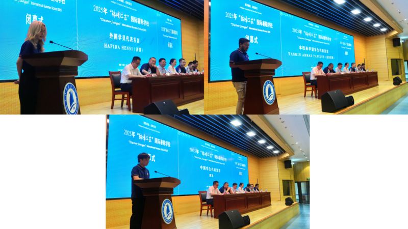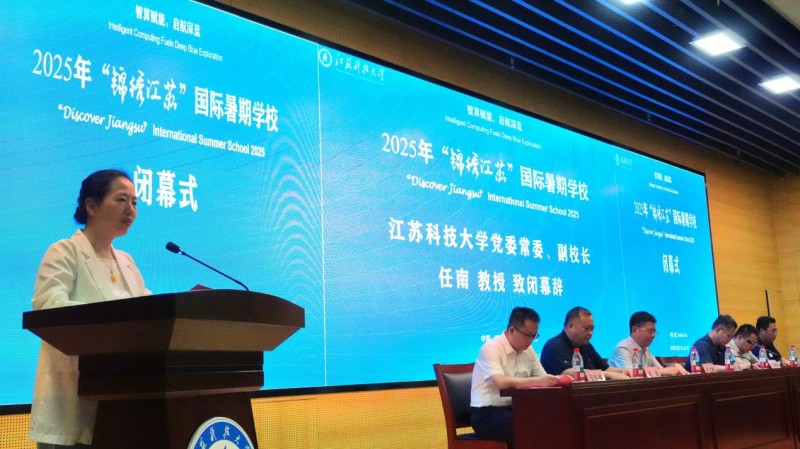 江苏科技大学党委常委、副校长任南为江苏科技大学2025年“锦绣江苏”国际暑期学校闭幕式致闭幕辞。任南副校长在致辞中首先回顾了本次国际暑期学校“智算赋能,启航深蓝”的主题,期望中外学员们能够在探索人工智能前沿科技知识和沉浸式感受镇江文化魅力后留下美好的回忆,用回忆编辑成增进中外文化交流的精彩代码,更期待每一位学员都能做中国故事的倾听者、传播者和讲述者。