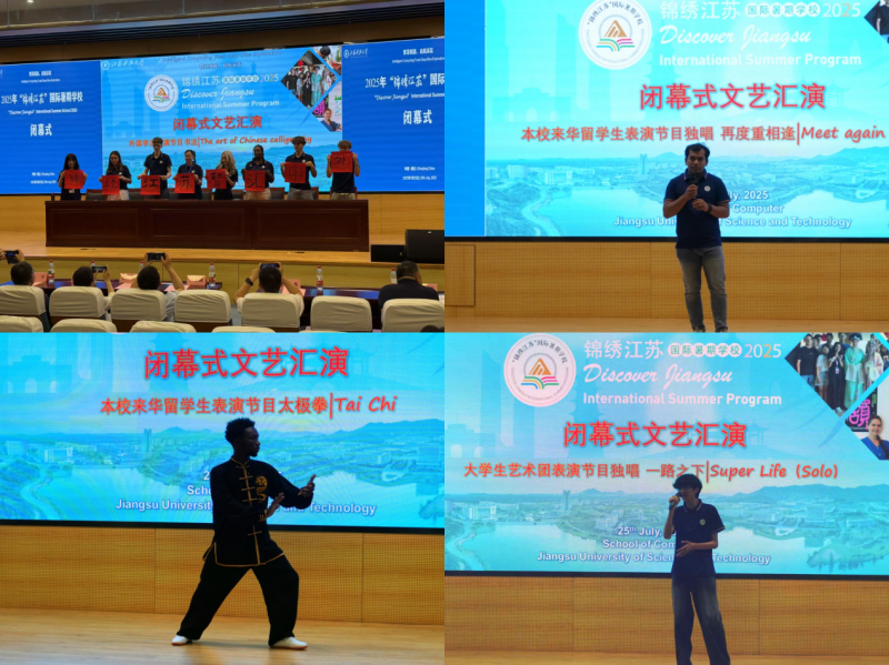 颁奖和发言环节后,参加此次国际暑期学校的中外学员和江苏科技大学大学生艺术团的团员向与会嘉宾和师生呈现了精彩的文艺汇演。法国学员们集体表演的中国书法“锦绣江苏 智汇中外”引来场内一阵阵掌声,我校留学生Thouhedul Islam Rafi演唱的歌曲《再度重相逢》,我校留学生Franck Rooswelt Tegang Sadeffo表演的太极拳有模有样,让观众连连竖起大拇指。中国学员郑飒带来的歌曲《一路之下》引得台下的观众阵阵欢呼。