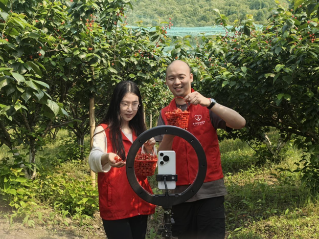 这天,助农直播间里热闹非凡。原来,是“香溢”志愿者开始了“卖货+卖景”的直播模式。大家通过邀请游客走进茶园,俯瞰茶山;或者吸引游客亲手采摘樱桃、草莓等时令水果,感受田园乐趣等方式,合理采用“直播+录播”的数据化营销策略,一边介绍当地农产品,一边生动展现和推广乡村的自然风光和文化底蕴。同时,主播们通过镜头展示乡村的绿水青山,吸引着众多外地游客前来体验。现场时不时还有游客入境,更为直播间添加了乐趣。游客们在享受乡村绿水青山的同时,还能购买新鲜农产品,带动了周边餐饮、民宿等产业发展。“我们利用周末时间带孩子来采摘水果,既能亲近大自然,又能支持农户,一举两得!这里的樱桃特别甜,孩子特别爱吃,我们也打算下次再来!”一位游客说道。