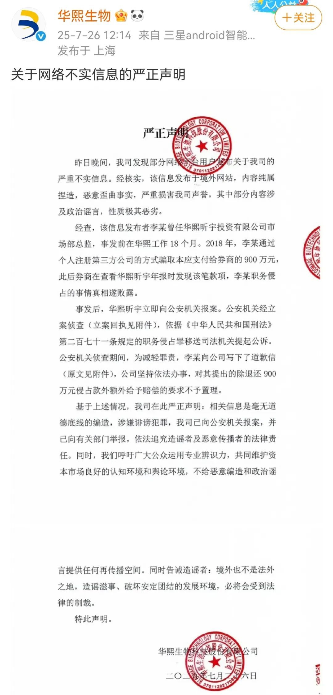 针对部分网络平台用户发布的相关信息,华熙生物官方微博7月26日发布声明称,内容纯属捏造,恶意歪曲事实,涉嫌诽谤犯罪,公司已向公安机关报案,并向有关部门举报,依法追究造谣者及恶意传播者的法律责任。