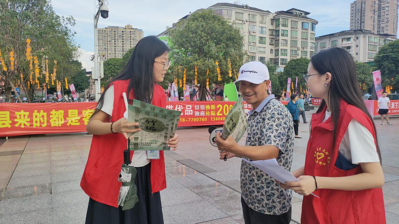 7月10日清晨,渠县万兴广场的树荫下,绿韵竹风实践队的同学们忙着分发印有“守护非遗”字样的调研宣传单。在宣传推广的过程中,队员们发现城镇居民对竹编的认知呈现“熟悉又陌生”的特点。多数人见过竹制器具,却少有人知晓“刘氏竹编”的国家级非遗身份,认可竹编的环保实用,却不知本地就有优质产品。针对这一现状,队员们重点向当地城镇居民讲解“家门口的非遗”这一核心信息,告知渠县刘氏竹编线下门店地址与营业时间,并现场以图片和视频播放的形式给城镇居民讲解刘氏竹编的观赏价值和实用价值。