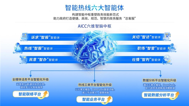 中国联通智能热线AICC 2.0产品,面向热线"诉求接入-坐席分办-高效办理-质量监管-民意洞察-决策支持”全链条进行智能化升级,创新六大政务热线智能体,推动政务服务从“响应式服务”向“多模态主动交互”跨越,实现民生诉求“一线应答”、民意数据“一屏洞察”。