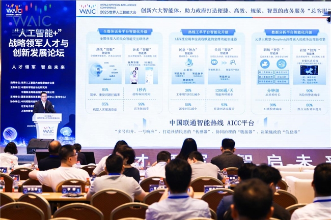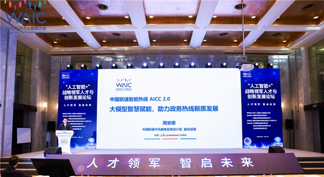 2025年7月27日,中国联通联合国家发展改革委培训中心、中国科学院自动化研究所,共同主办2025世界人工智能大会“人工智能+”战略领军人才与创新发展论坛,期间重磅发布“中国联通智能热线AICC 2.0产品”。论坛旨在与政、学、产、研领域嘉宾代表围绕“人工智能+”行动“战略领军人才体系建设”与“创新能力发展”,进行前瞻理论与实践经验分享,来自政府机构、科研院所、企业和媒体的专家、记者等近300人参与论坛,共同探讨人工智能引领下的创新发展新形势。