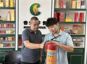 图为“香溢”志愿者现场指导零售户使用灭火器