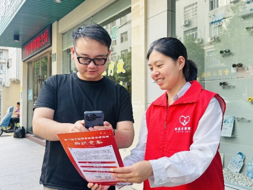 图为香溢志愿者(右)向群众宣传“第三届全国烟草管理法律法规知识竞赛”活动