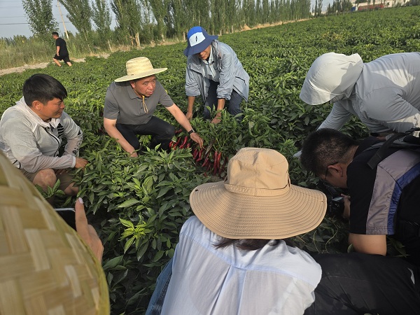 上图:邹学校院士一行在博湖县辣椒基地了解辣椒使用小分子肽植物营养液情况