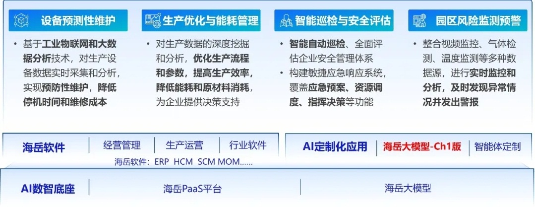 浪潮海岳大模型-Ch1版搭建“大模型基座-垂域大模型-智能体应用”的三层功能体系,以浪潮海岳PaaS平台和海岳大模型为数智底座,采用“判别式AI+生成式AI”的复合式AI架构,基于服务化工行业积累的专业数据及知识,融合行业知识体系、工艺机理与企业运营数据,开展模型训练和能力调优,形成设备预测性维护、生产优化与能耗管理、智能巡检与安全评估、化工园区风险监测预警等核心能力;深度依托多模态感知融合与智能决策优势,提供面向化工领域的“工艺参数优化-设备故障预警-安全风险防控”一体化解决方案。
