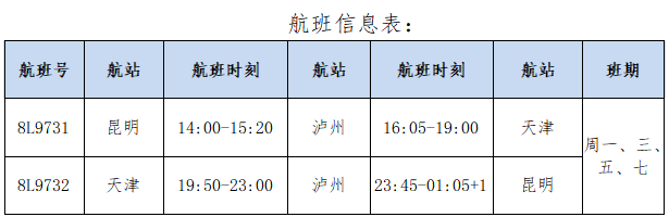 祥鹏航空昆明⇋泸州⇋天津航线,计划每周一、三、五、七各执飞一个往返航班,去程航班号为8L9731,计划于14时从昆明起飞,15时20分抵达泸州,短暂停留后于16时05分从泸州起飞,于19时抵达天津;返程航班号为8L9732,计划于19时50分从天津起飞,23时到达泸州,经停后于23时45分从泸州起飞,于次日01时05分抵达昆明。(暑期航班计划可能有变动,具体班期、时刻等信息以实际查询为准)