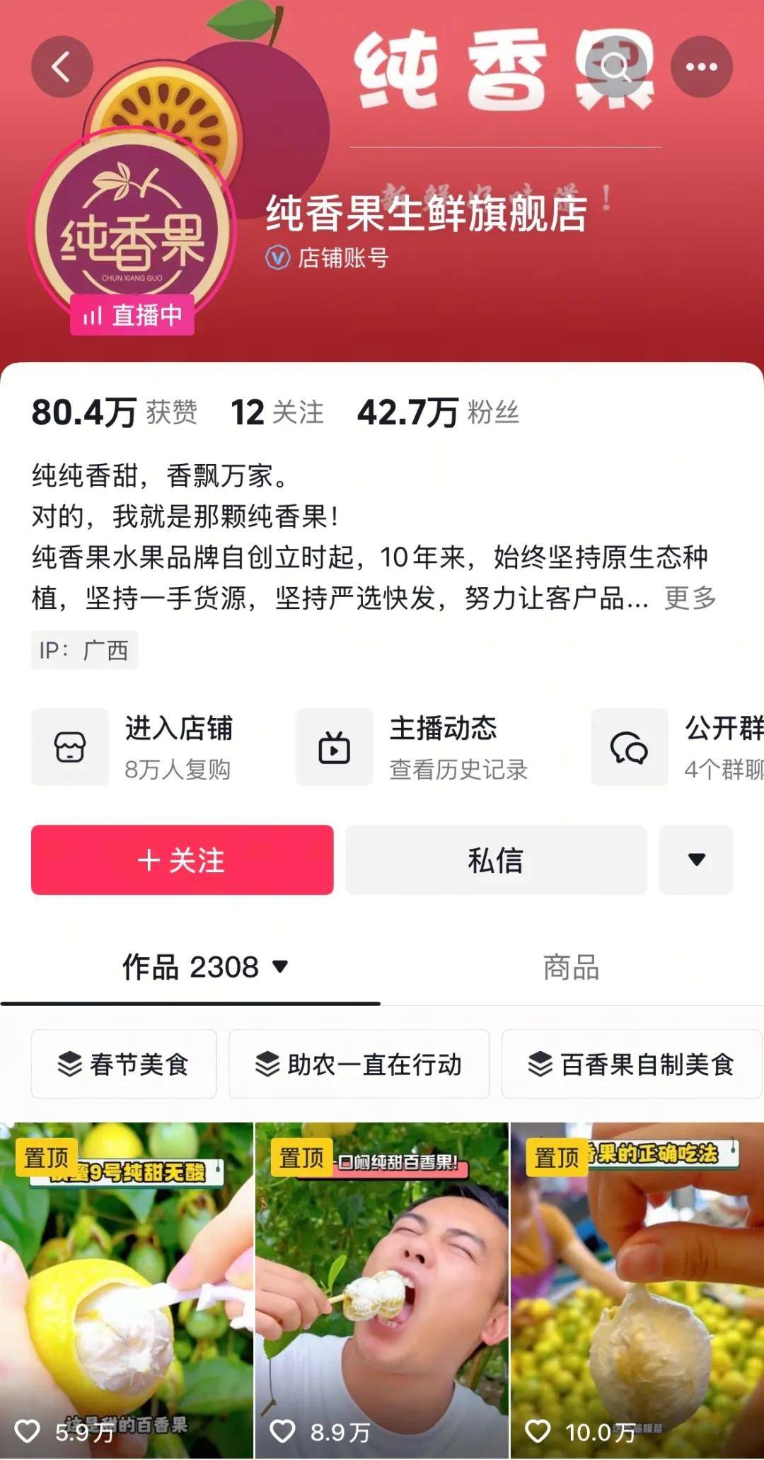 @纯香果生鲜旗舰店 的抖音主页截图