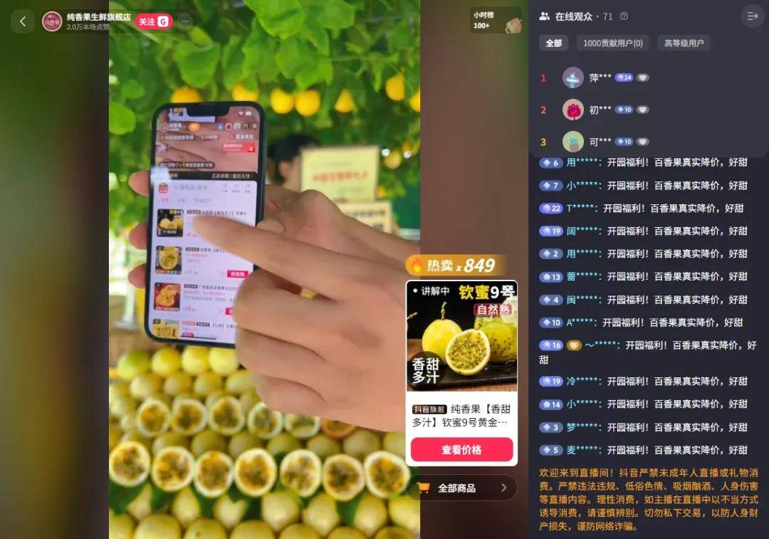 他还想出了“日不落”直播——即24小时不停轮播,增强账号的差异化。“也是因为爆了之后,及时把握机遇。”杨兴忠说,他们从早上7点播到第二天早上7点,凌晨2点到5点则是老板亲自上阵。所有人在果园里轮班,反反复复介绍百香果是怎么种出来的、怎么剥、怎么吃。