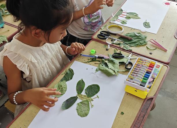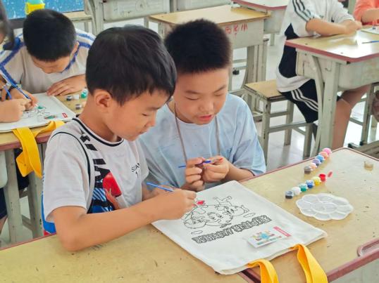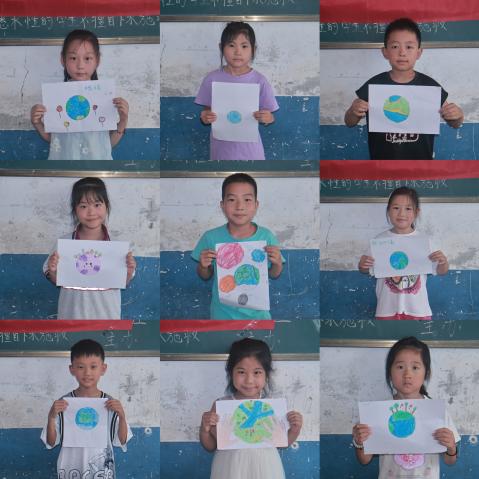 实践团创新融合绿色教育与美育,让环保理念深入人心。杨斯雅、马奕琳、程光升、花晓蔓深入浅出地介绍了可持续发展知识,推广了低碳生活与可持续发展理念。绿色环保活动内容和形式多样,在孩子们幼小的心田中,播撒下了绿色发展以及可持续发展的种子。“袋绘绿韵,布染自然”帆布袋DIY活动中,孩子们用环保颜料绘制绿水青山、濒危动物等图案,传递“以袋代塑”的低碳理念;“绿绘地球,共护家园”活动中,孩子们生动描绘心目中的地球,提升环保意识,宣传环保理念;“创意拼贴,叶语绿色”活动中,孩子们以树叶为素材,在手工创作中锻炼动手能力,潜移默化中传递环保与可持续发展的理念;“诗韵护绿,童声筑蓝”诗歌创作活动中,孩子们既体验各种趣味诗歌的创作过程,又用文字呼吁环保,让绿色理念在艺术中扎根。从知识讲解到实践创作,环保理念通过美育形式变得生动可感,真正内化为孩子们的自觉意识。
