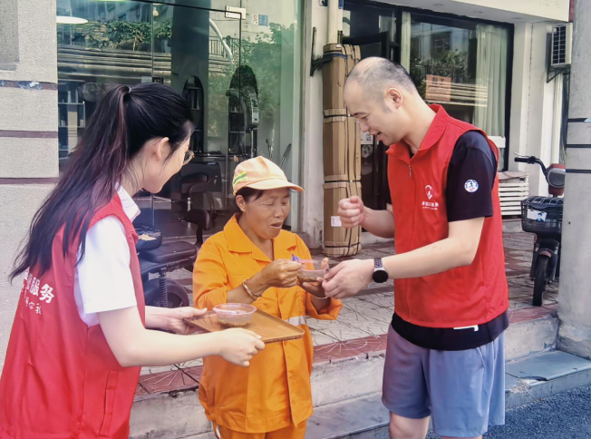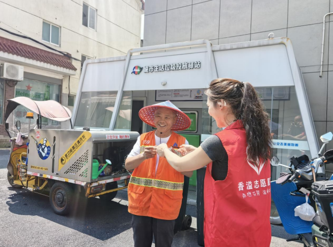 图为香溢志愿者给垃圾投放驿站工作人员送绿豆汤 金莎莎摄