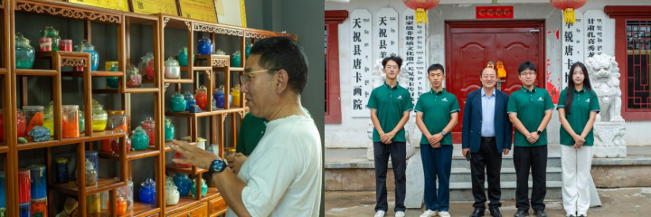 在天祝县唐卡博物馆,实践队拜访了国家级非物质文化遗产华锐画派第五代嫡传者、传承人更登嘉木措和“陇原工匠、大国工匠培育对象”马才成先生。在静谧的展厅内,更登嘉木措详细介绍了唐卡制作的每道工序,从矿物颜料研磨到线条勾勒,生动阐释着“十年磨一剑”的工匠精神。他期待以普通话为媒介,让唐卡艺术走向更广阔的舞台,让实践队成员深刻认识到推广普通话对非遗传承的重要意义。