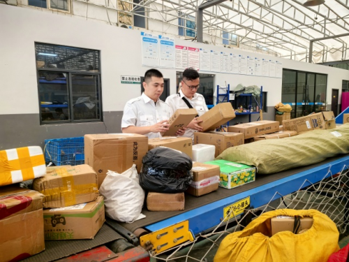 图为毛炜(左一)与同事在快递分拣中心查找涉烟包裹(程曦 摄)