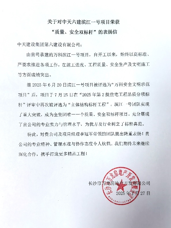 7月25日,由中天建设集团第六建设有限公司(以下简称“中天六建”)承建的长沙万科滨江壹号项目再传捷报,在万科集团2025年第2批住宅工程品质分项标杆评选中,该项目凭借卓越的品质效果呈现和精益求精的过程管理,成功荣获"主体结构分项标杆项目"称号。这是继6月20日荣获万科集团"安全文明示范项目"后,滨江壹号项目在短短两个月内斩获的第二项集团荣誉,更成为万科集团唯一一个质量、安全双标杆项目。这不仅彰显了中天六建在高端住宅建设领域的综合实力和专业水准,更成为中天与万科战略合作历程中的里程碑式成就。