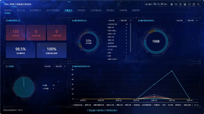 6、智慧赋能,管理提质增效。项目部技术负责人贺正伟介绍道:"通过智慧工地平台,我们实现了对关键施工过程和质量数据的实时监控。智慧大屏上跳动的不仅是数据,更是品质保障的脉搏。"平台集成了AI视频监控、深基坑监测、智慧物料验收、塔基智能监测、智能喷淋系统、混凝土养护监测等多项功能,其中混凝土养护监测能确保强度发展曲线完美匹配设计要求。在安全方面,项目团队构建了"智慧+标准"双轮驱动的安全管控方式:研发应用临边安全挂钩系统、模块化电梯井防护平台,防火管理引入自动感应灭火装置,同时全面应用AI隐患识别和高危作业管控APP等数字化手段,提升安全管理效率。
