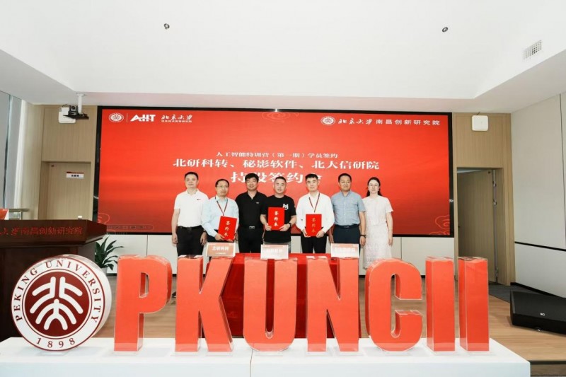 7月5日,北京大学信息技术高等研究院(以下简称“北大信研院”)与北京大学南昌创新研究院(以下简称“北大南昌院”)联合主办,北研科转(杭州)科技有限公司承办的首期人工智能特训营结业典礼暨学员签约仪式在南昌圆满举行。北京大学力学与工程科学学院研究员、北大南昌院执行院长成名,院长助理李卯、余晓峰,以及数字经济研究中心运营总监谢艳玲等嘉宾出席活动。在北大南昌院领导的见证下,北大信研院智能物联软硬件产业化推广实验室主任、北大南昌院人工智能产业化实验室副主任易海明,北研科转(杭州)科技有限公司(以下简称“北研科转平台”)CEO张乐,杭州秘影软件技术有限公司(以下简称“秘影软件”)董事长彭乘龙分别代表三方签署持股协议,标志着合作迈入新阶段。
