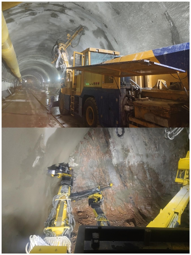 项目团队在广福隧道施工中首次应用三臂凿岩台车和锚注一体机,三臂凿岩台车具有智能精确定位、钻孔高质高效、超前地质分析等特点,凿岩速度远超传统人工手持风钻作业工效,能够极大提高单孔成孔效率;锚注一体机钻孔可满足自动钻孔、自动安装锚杆、施加预应力、自动注浆等功能,适应各类锚杆的一体化施工,解决了人工钻孔定位偏差大、注浆饱满度低和人工作业风险高等问题,平均每循环钻爆和锚杆工序用时减少5小时,充分发挥人、机、料等多方协同效能,全面提升隧道施工工效。