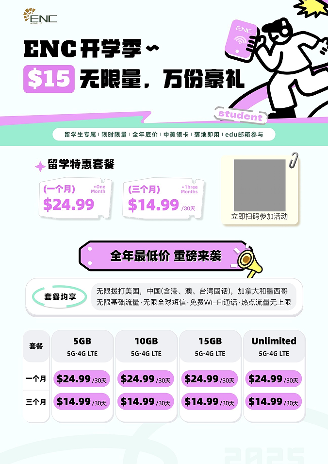 面对即将入境的留学生在通信上的高频刚需,美国本地通信服务商 ENC Mobile 正式上线“2025秋季留学生专属美国手机套餐”,提供多功能全场景通信解决方案。