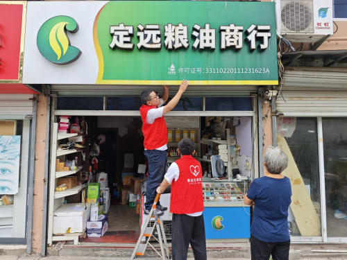 图为“香溢”志愿者协助零售户加固店招