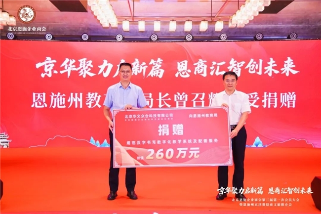 北京恩施企业商会常务副会长北京华文众合科技有限公司董事长向大凤为恩施州100所学校捐赠价值260万元的智慧教学系统恩施州教育局局长曾召辉同志接受捐赠。