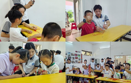 7 月 14 日,实践团在赛宝花园居民活动室开启首场非遗课程 ——“红绳巧系,童心结艺” 中国结文化体验课程。主讲人从远古 “结绳记事” 的实用功能讲起,梳理中国结从实用工具到装饰艺术的演变历程,用简洁语言勾勒文化传承轨迹。志愿者们将复杂编法拆解为连贯步骤,逐个指导孩子们穿线、打结。孩子们专注模仿,虽作品略显稚嫩,却承载着认真与投入,完成后纷纷举着中国结展示,成就感溢于言表。课程尾声,志愿者带领孩子们玩起传统翻花绳游戏,编织降落伞、星星等造型,在欢乐互动中锻炼动手能力,增进友谊。