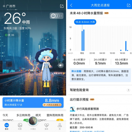 台风带来的强降水往往比大风更具破坏性。墨迹天气基于其高时空分辨率预报能力的大雨定点速报、分钟级降水地图功能可以帮助用户先一步了解降水情况。通过监测和预测未来短时间内某具体区域(如街道、社区)将出现强降雨时,大雨定点速报会及时推送预警信息,提醒用户该地点即将面临强降水风险,还结合降水情况提供步行、骑行、驾驶三种出行方式的建议。