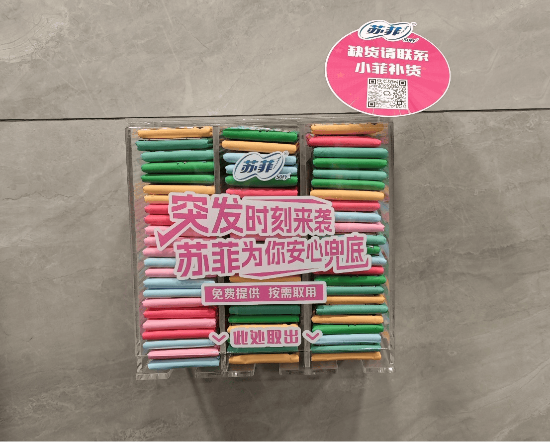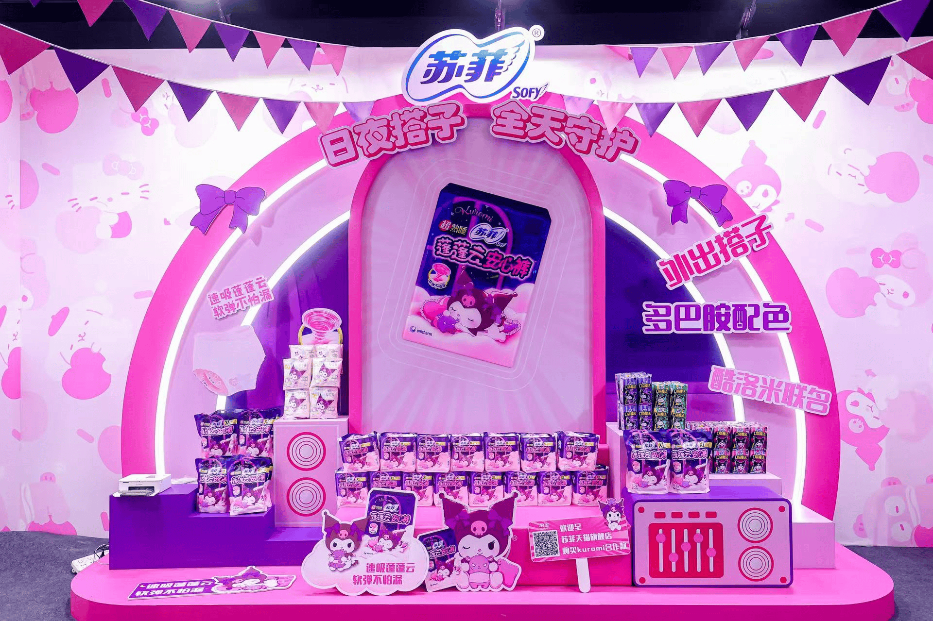 苏菲在嗨翻节场馆内设立核心展区时,特别关注女性实际需求场景——在洗手间区域设置卫生巾免费自取点。三丽鸥家族酷洛米合作款产品以开放姿态置于公共区域,传递核心主张:经期健康管理不应是隐秘的负担,而应是社会支持体系中的自然环节。该举措既是品牌对参展女性的即时关怀,亦是对“消除经期羞耻”理念的具象实践。