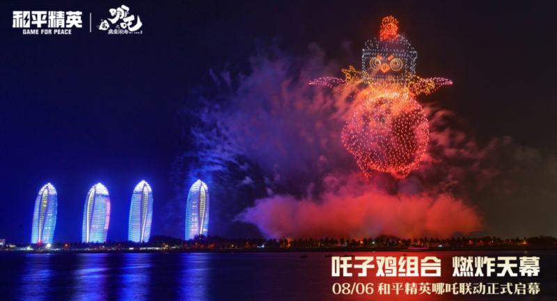 赛前,在8月6日晚间,三亚・中交凤凰岛夜空上演了一场《和平精英》X电影《哪吒之魔童闹海》IP联动花火秀。浏阳现象级爆款“天空之门”无人机团队,携手国家级花火团队蔡国强工作室设计师肖祺缘,共创打造「吒子鸡组合」无人机花火表演,将3000架无人机与多层次立体花火组合,在空中还原“哪吒”和“飞天猪”等形象,点燃三亚地标——鹿回头观景平台与椰梦长廊的夜空,为即将开幕的2025和平精英国际主播赛(2025 PSI S5)总决赛暨空投节刺激之夜年度潮流大秀提前暖场。