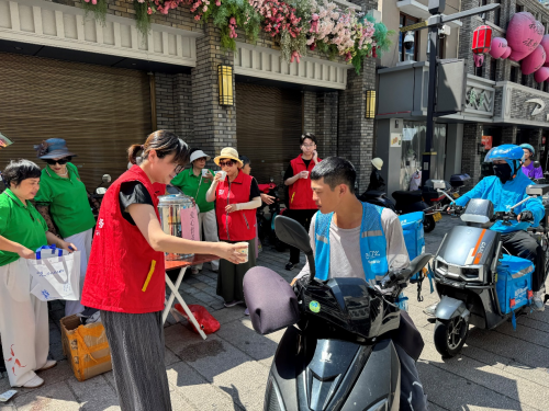 图为志愿者帮外卖小哥递伏茶。孙嘉烽 摄
