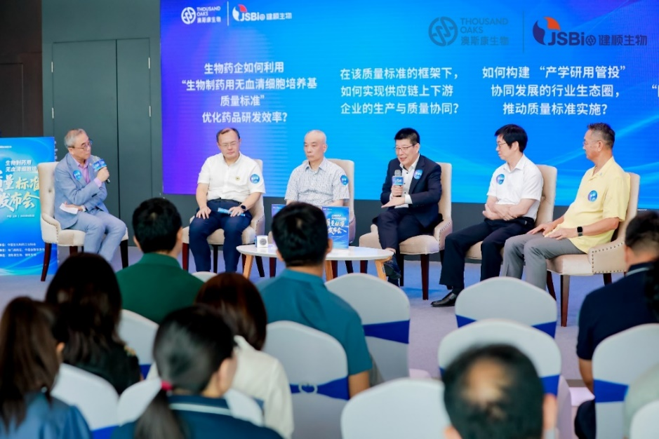 标准发布仪式后,在圆桌讨论环节,由澳斯康生物集团CEO罗家立博士主持,中国生化制药工业协会常务副会长兼秘书长胡文言先生、中国生化制药工业协会专家委员会副主任委员陈钢先生、中国生化制药工业协会副秘书长饶春明先生、恒瑞医药董事、执行副总裁张连山先生、澳斯康生物董事长兼总裁罗顺先生聚焦四大核心议题展开讨论。