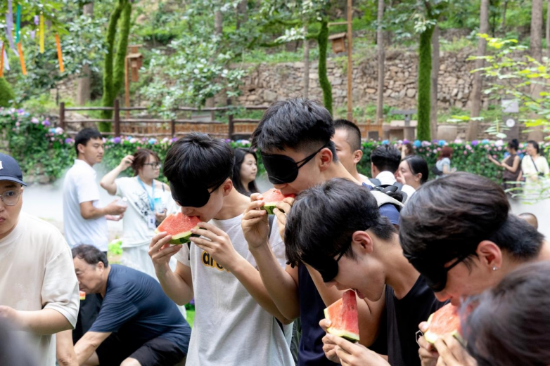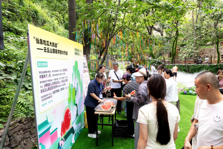 红瓤黑籽映衬着满足的笑靥,清甜的汁水顺着指尖流淌,不仅滋润了夏日的燥热,更传递着土地最质朴的芬芳。咔嚓的啃咬声、由衷的赞叹声、游戏获胜的欢呼声,与林间蝉鸣、泉水叮咚交织共鸣,共同谱写着“免费共享”的夏日欢歌,汇成游客最富体验感的夏日出行。