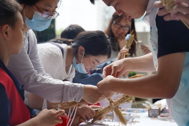 “稻草除了焚烧还田,还可以用作培养蘑菇的基质等,现在我们还可以用来编制稻草人!”团队结合专业所长,在江苏科技馆、新街口商圈、南京九中开展了多场“废弃农作固体物焕新生”主题活动。队员们先向参与的小朋友讲述秸秆焚烧的危害——不仅污染空气,还会破坏土壤微生物群落;再演示秸秆的绿色处理方式:粉碎还田可作为有机肥,压缩成型能当生物质燃料,而编制稻草人则是兼具趣味与教育意义的“变废为宝”的实践。