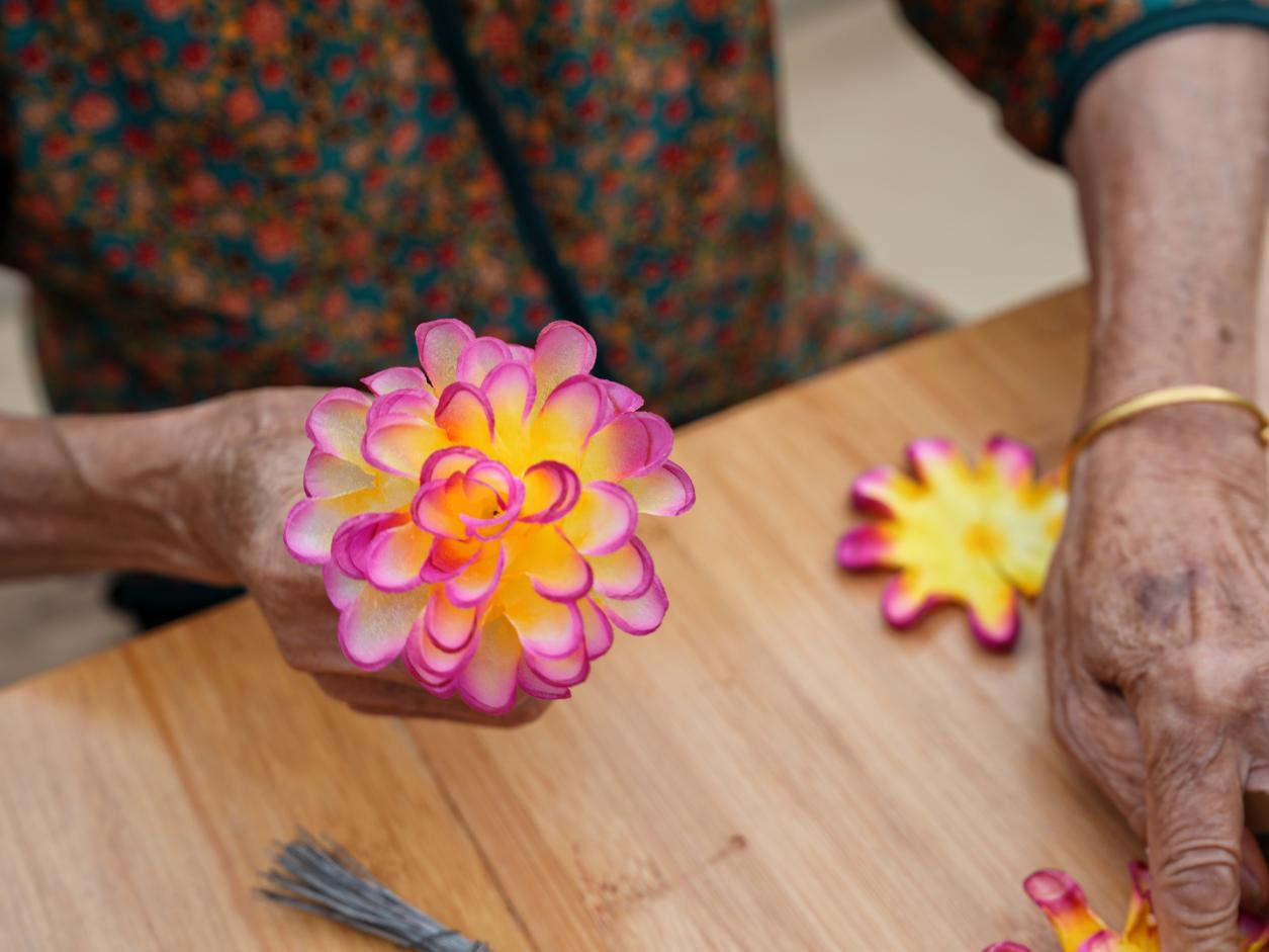 方岩景区改造之前,作为土生土长的方岩人,朱仙玉的家就在方岩山脚下,八九十年代每逢方岩庙会,香火旺盛,年轻的朱仙玉总跟着家里的阿姨婶婶熬夜做花,第二天再上山卖花。那时候,山门口、庙檐下、香客肩头,处处是这些花儿的身影。