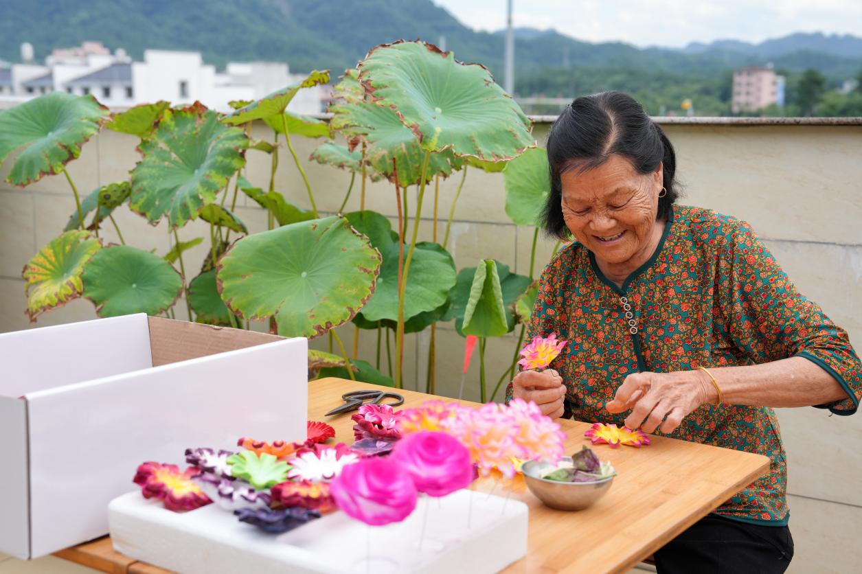 图为朱仙玉婶婶在制作传统纸花。永康市烟草专卖局供图