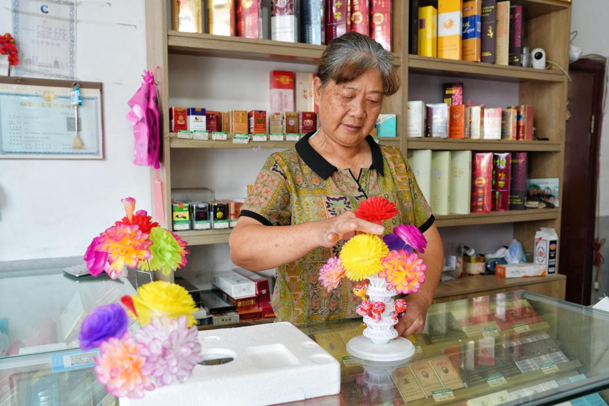 图为朱仙玉用纸花装饰柜台。永康市烟草专卖局供图